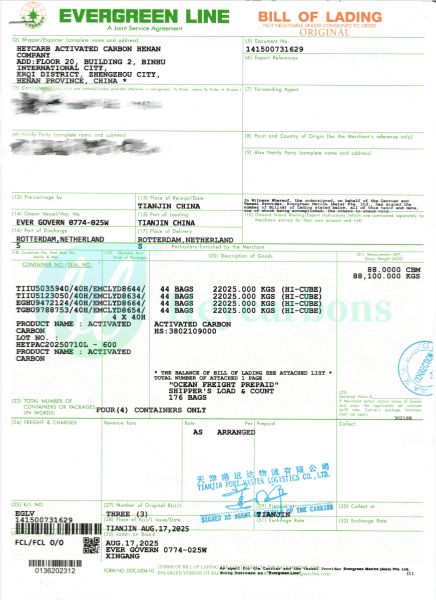 The picture below shows the bills of lading and photos of shipement for Heycarbons activated carbon shipped to the Netherlands and Germany.
